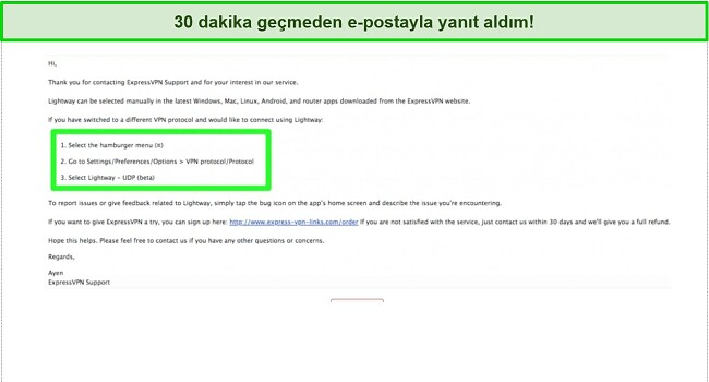 ExpressVPN’in Türkçe uygulamalarını indirmek ve kullanmak son derece hızlı ve kolaydı çünkü her platformda, birbirine benzer bir arayüz kullanmışlar. Bu sayede Windows PC ve iPhone arasında geçiş yaparken zorlanmıyorsunuz. Lightway protokolü hakkında bir soru sormak için ExpressVPN’e e-postayla ulaştığım zaman, 30 dakika içinde cevap alabildim. Sorularınız için [email protected] adresini kullanabilirsiniz. ExpressVPN’in kendi sitesine Çin’den erişemediğiniz için e-posta desteğinin bu kadar hızlı ve yardımsever olması beni çok memnun etti.