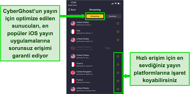 iPhone’da birkaç dokunuş ile Netflix ABD, Disney+, Hulu, vb. için sunuculara hızlı bir şekilde bağlanabilirsiniz. Bu yayın sunucularını test ederken, başlangıçta görülen ara belleğe alma işlemi gibi sorun yaşamadım ve yayın akışları saatlerce HD kalitesinde devam etti. Ekibimle birlikte denediğim tüm yayın platformlarına CyberGhost rahatlıkla erişim sağladı. Örneğin: